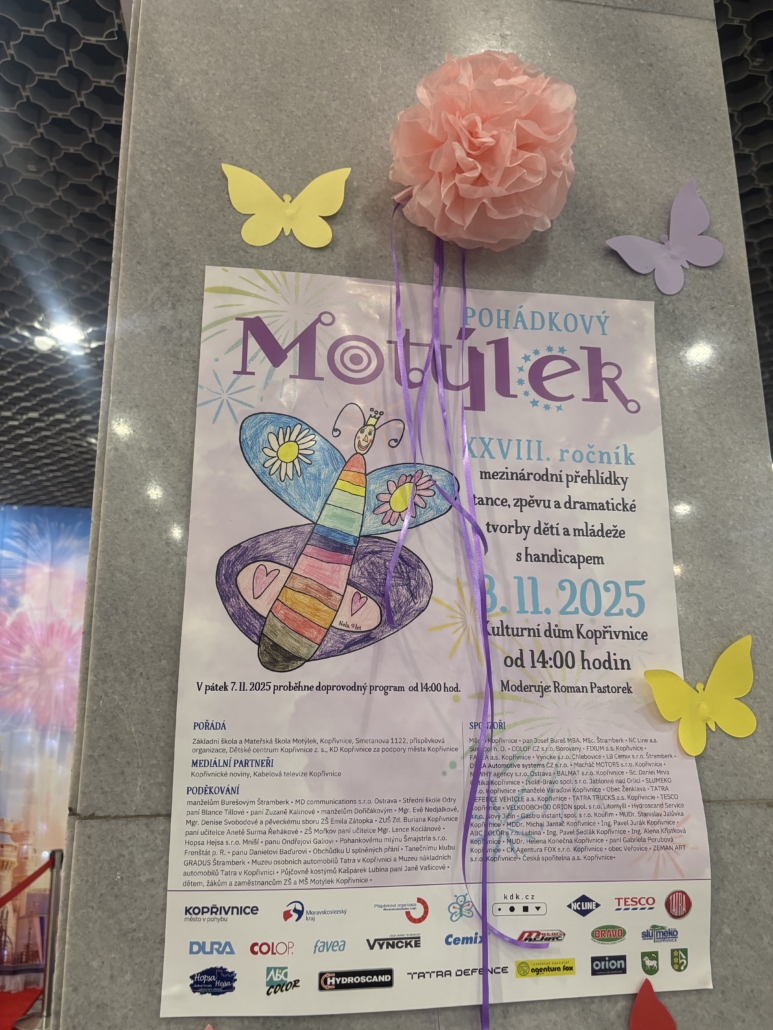 V sobotu 8.11.2025 se vybraní žáci Odborného učiliště a Praktické školy zúčastnili v Kopřivnickém Kulturním domě 28. ročníku pohádkového Motýlka 2025, kterou pořádá ZŠ a MŠ Motýlek, p.o., Kopřivnice, Dětské centrum Kopřivnice z.s., KD Kopřivnice za podpory města Kopřivnice. Je to mezinárodní přehlídka tance, zpěvu a dramatické tvorby dětí a mládeže s handicapem. Žáci OU si pod vedením pedagogů připravili vystoupení s názvem „Mimoni“ a žáci PrŠ vystoupení s názvem „Pohádka o Červené karkulce – trošku jinak“.