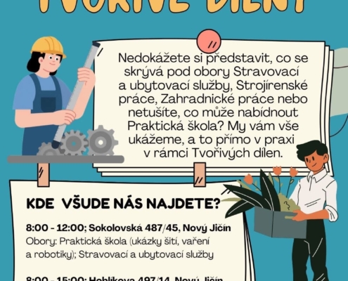 AktualityVe čtvrtek 8.1.2026 pořádá naše škola "Tvořivé dílny". Pro zájemce o studium na Odborném učilišti od 8,00 do 15,00 hodin a zájemce o Praktickou školu od 8,00 do 12,00 hodin.